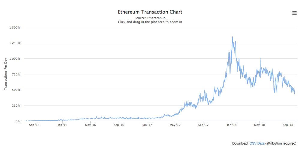 这些文章中提出的有些问题是合理的,但是往往忽略了以太坊每天在扩展性方面取得的惊人进展。我们需要承认的是,当前以太坊的状态尚无法使其扩展成为世界计算机,网络的吞吐量低、成本费用高。但是,这些问题在以太坊被创立出来之前就已经预料到了,并且已经得到了很好地理解。在过去几年中,已经创建出了多种解决方案来应对这些问题,本文将对这些解决方案加以探讨,希望读者能在阅读本文后更好地了解以太坊的扩展性解决方案。  以太坊网络的交易量趋势图,来源:Etherscan.io