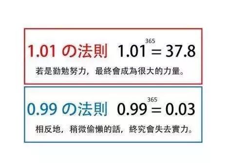 如果每天进步1%,例如每天看书,锻炼等等,1年后,这个人的水平是:(1+1%)365=37.38;反过来,如果这个人每天退步1%,例如坚持玩手机、刷微博,每天熬夜半小时,身体透支1%,1年后,这个人的水平是:(1-1%)365=0.025。