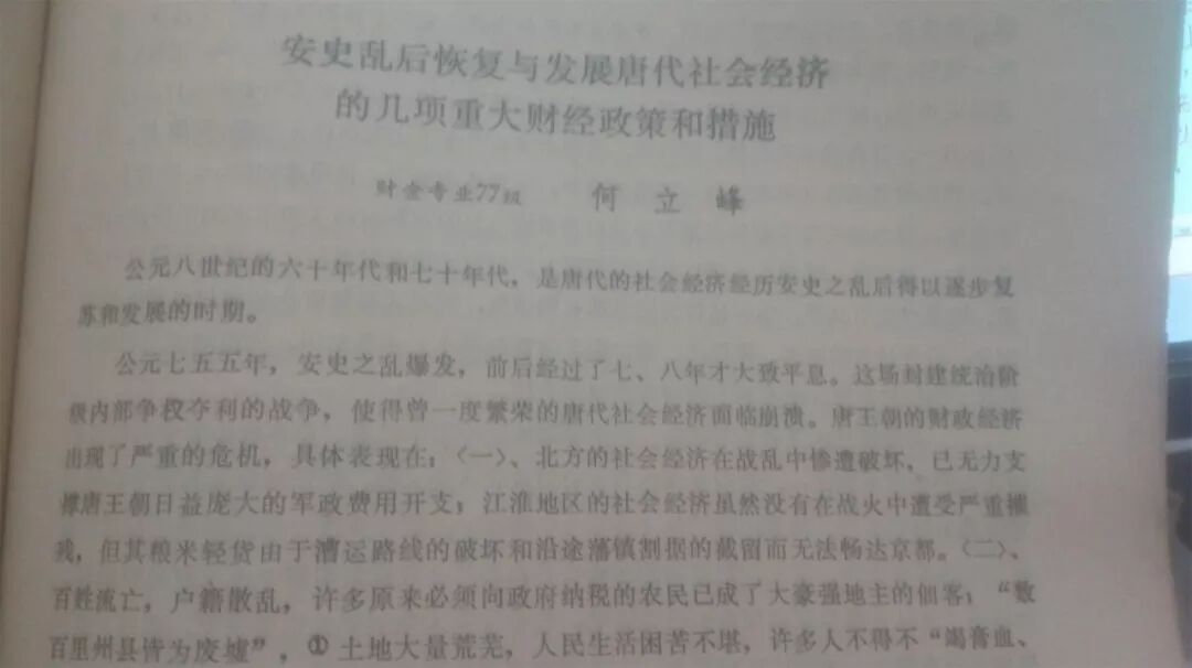 经济系是超级大系,人才济济,11篇论文居然占了文集的三分之一强:曹之虎、徐楚炫、杨黎明、蒋维等同学分别撰写的论文从不同的角度探讨了改革开放初期一些比较敏感的问题,牛犊之声虽然稚嫩却虎虎有生气,朱崇实同学在《充分地合理利用我国的人力资源》一文直面弊端,青锋如霜:“我们由于形而上学的‘社会主义思想’的影响,对劳务出口问题忌讳很深,今天我们再也不能无视这个问题了。”财会专业朱之文等7同学则联袂撰文,探索社会主义经济核算的客观基础。何立峰同学的《安史乱后恢复与发展唐代社会经济的几项重大财经政策与措施》以史为鉴,痛定思痛,用心良苦于文革动乱之后的财经大局!而邓力平同学的《资本主义国家对外贸易“奖出限入”与扩大进口政策的剖析》拉近甚至明晰了人家发家富国之生意经的规律与意图。