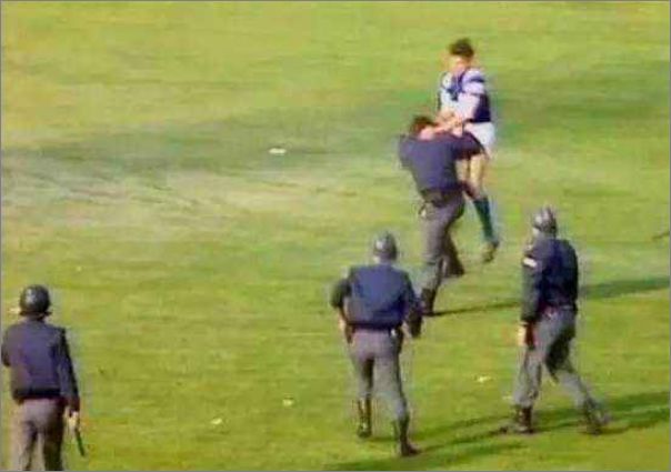 他看到现场的一位警察在帮着塞尔维亚球迷在驱打克罗地亚球迷