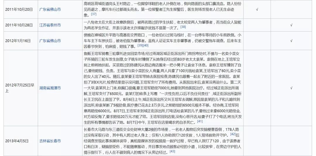 南京彭宇案后引发了全中国关于扶不扶的讨论,即使最高人民法院出面证实老太太确实是彭宇所撞,因为害怕赔偿高谎称冤枉,只是法官一句不当的话才推向了媒体热议,但公众对此并不买账,很少人去关注真相,所以彭案的遗毒仍然影响至今。
