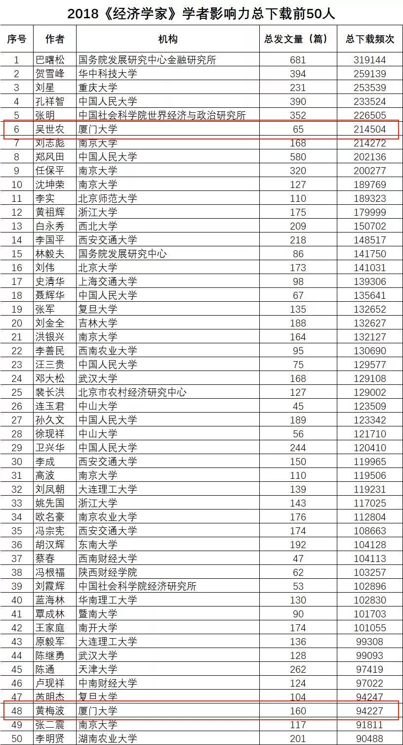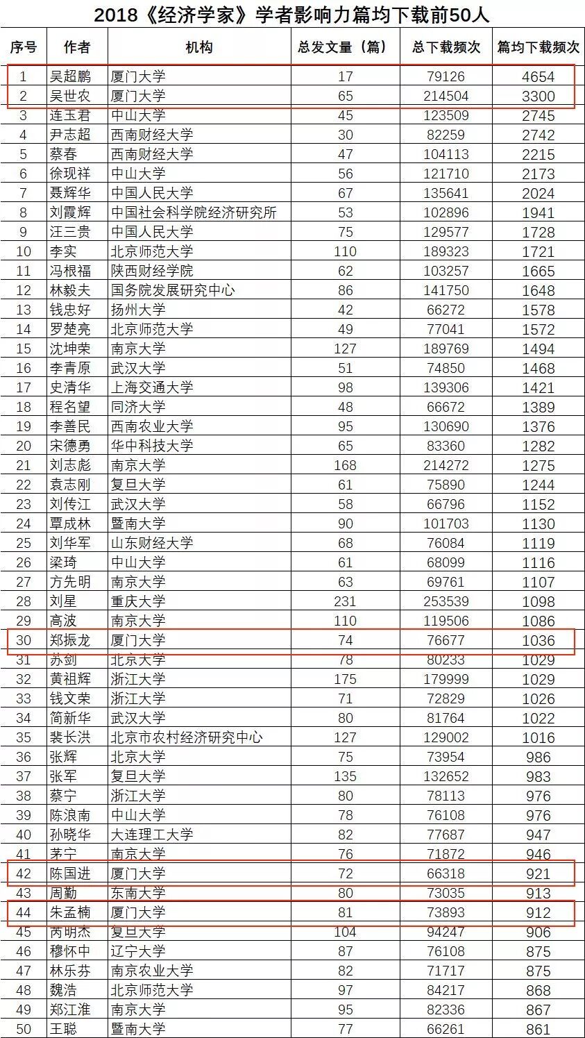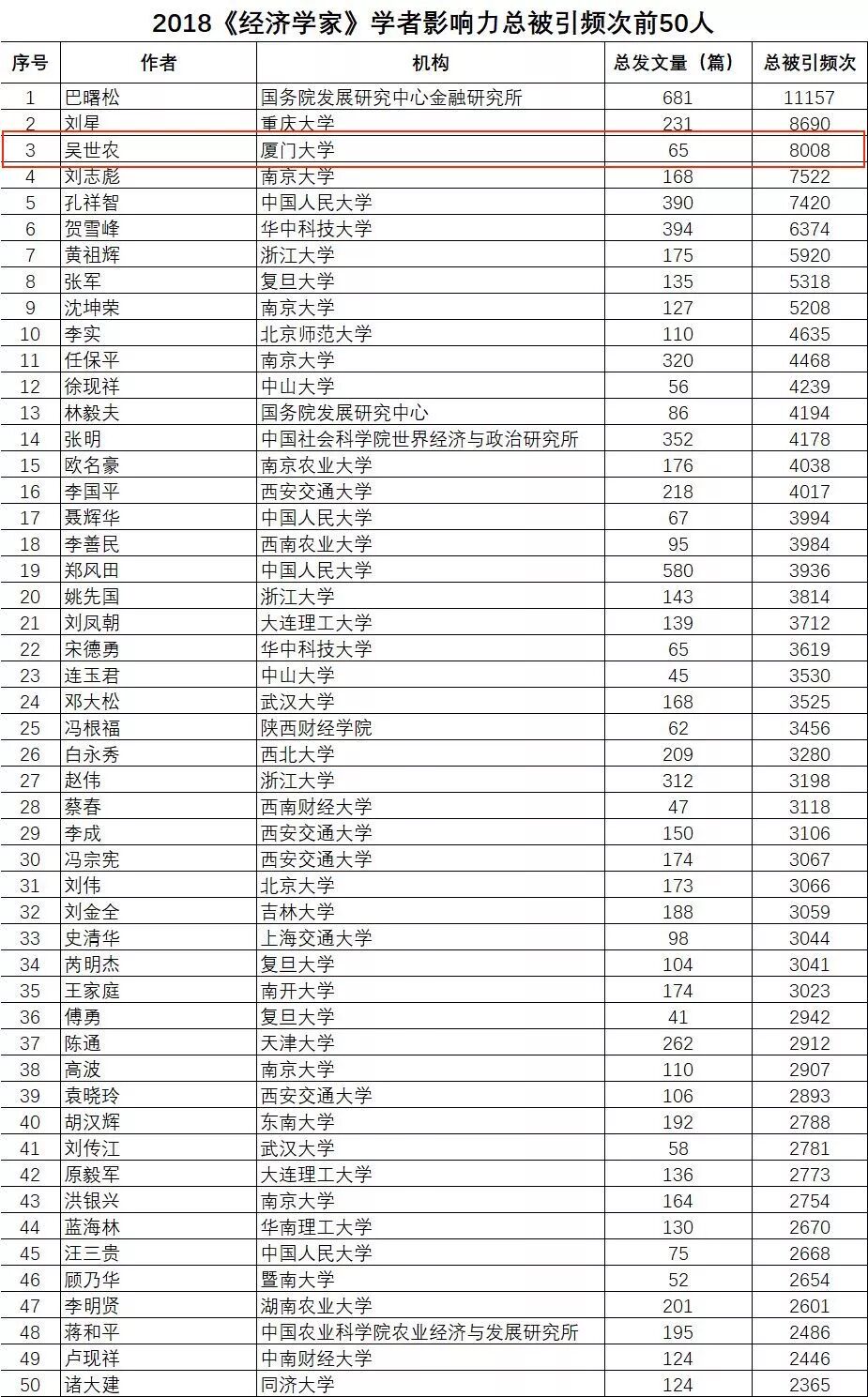 “2018《经济学家》学者影响力篇均被引频次前50人”和“2018《经济学家》学者影响力篇均下载前50人”两个部分中,吴世农教授和吴超鹏教授分别位列第一位。
