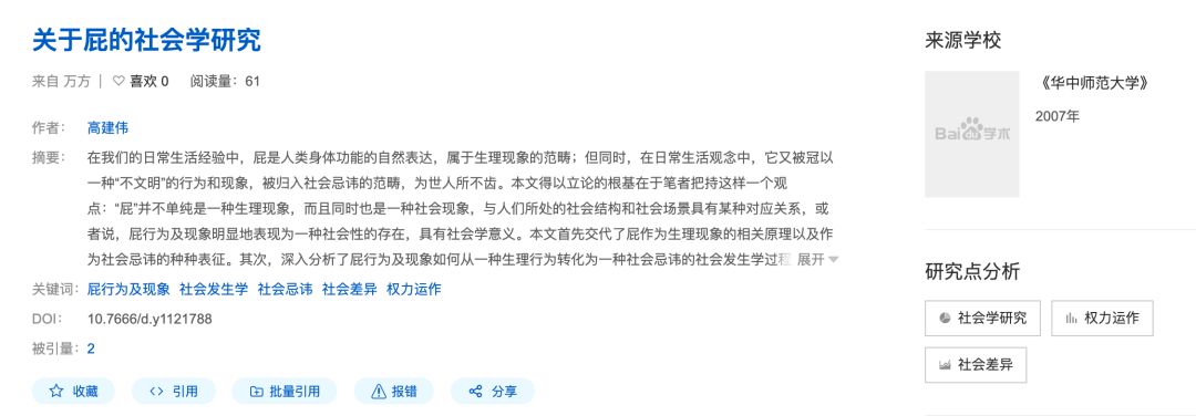 作者一脸严肃地告诉我们,“本文得以立论的根基在于笔者把持这样一个观点:“屁”并不单纯是一种生理现象,而且同时也是一种社会现象,与人们所处的社会结构和社会场景具有某种对应关系,或者说,屁行为及现象明显地表现为一种社会性的存在,具有社会学意义。”