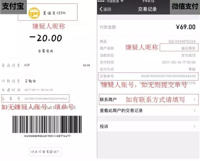 ●嫌疑人昵称:微信支付、支付宝交易截图上的收款商户名称