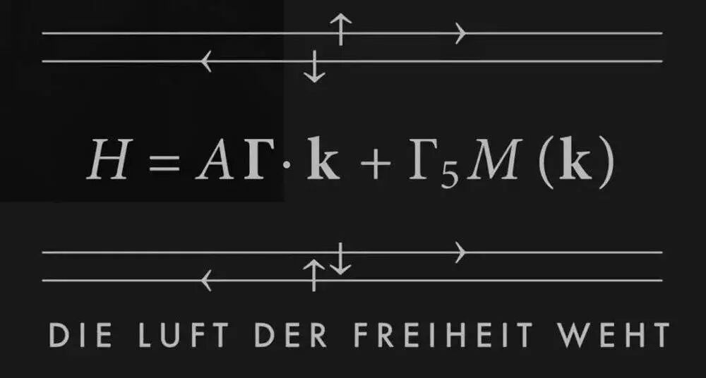 这个公式浓缩了首晟在拓扑绝缘体领域的学术研究的精华,描写了量子自旋霍尔效应和拓扑绝缘体中的电子运动规律。(H和k代表了电子的能量和动量,Γ和Γ5是狄拉克矩阵,而A和M(k)分别是依赖于物质结构的常数和函数。)首晟写下这个公式的灵感来自于他的偶像狄拉克,而这个公式也正是狄拉克方程在固体物质中的修改和推广。公式上下方的图画代表了从这个公式导出的量子自旋霍尔效应边缘的自旋电流。最下方则是斯坦福大学的校训:“自由的空气在飘扬”。