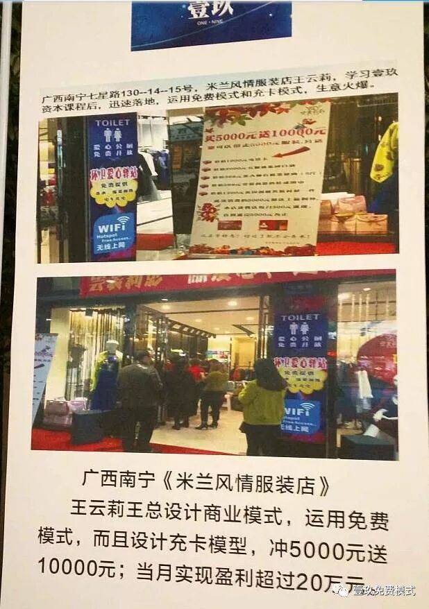 服装行业—广西南宁《米兰风情服装店》七星路130—14,15号,服装店老板王云莉,学习壹玖免费商业模式后,就实行落地,开设免费公厕和免费WIFI,而且设计充卡模型,充5000元送10000元产品,当月实现盈利超过20万元。